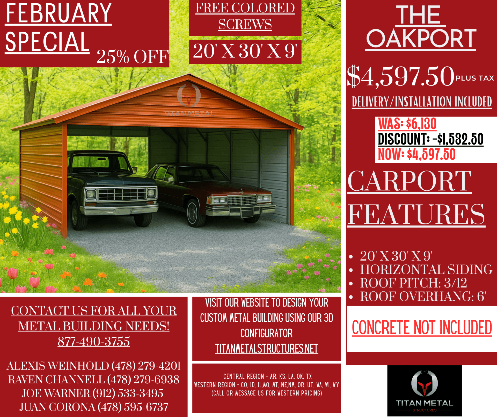 We purchased a 24’x 26′ carport from Titan Metal Structures. We are very pleased with our carport! They installed it on the day scheduled and the workmanship was Awesome! The crew was very friendly and cleaned up the area when finished. Highly recommend Titan Metal Structures!